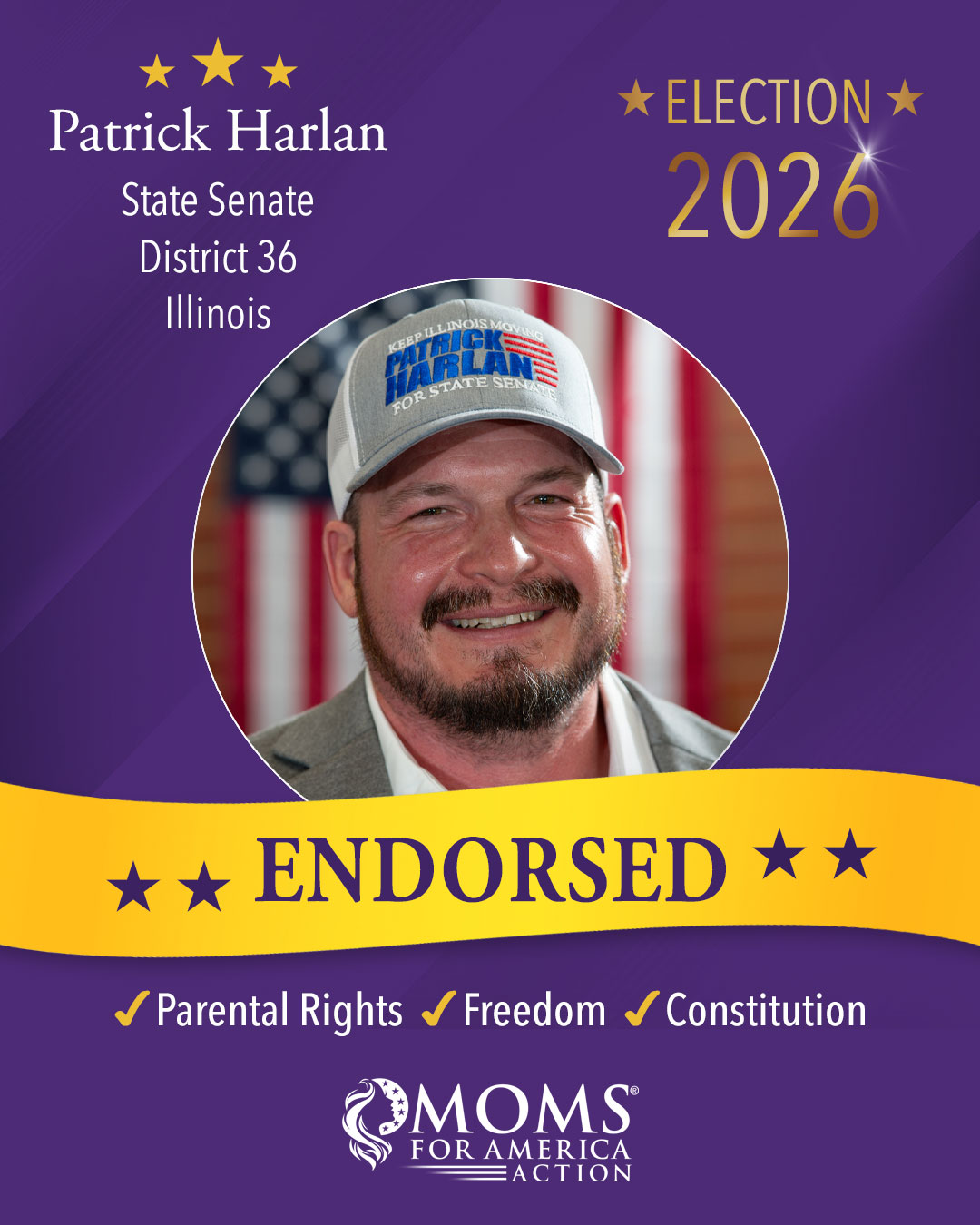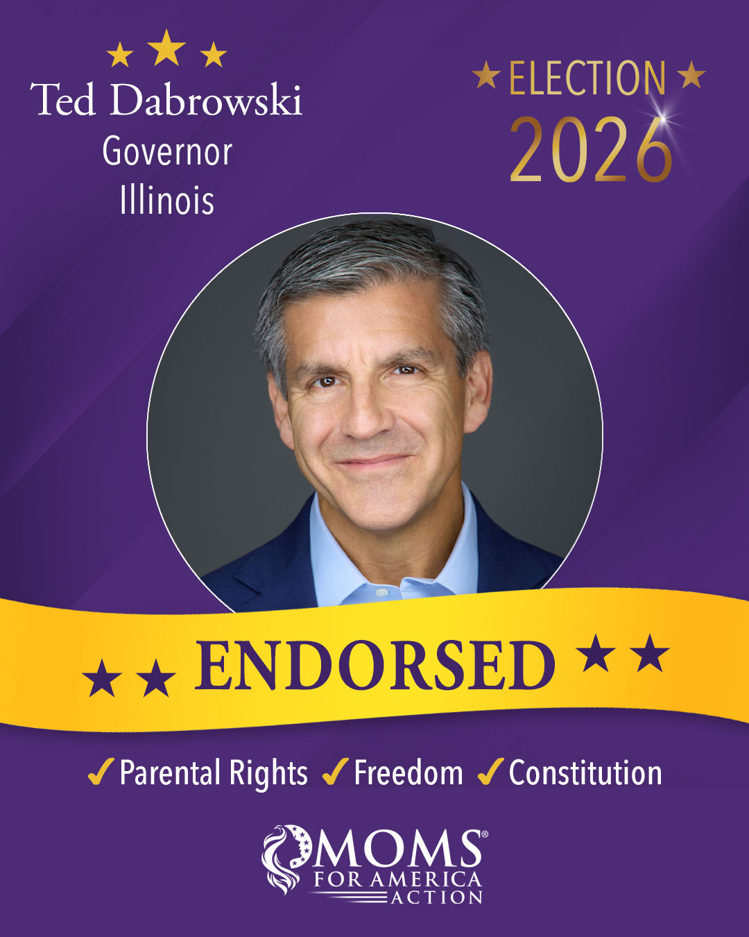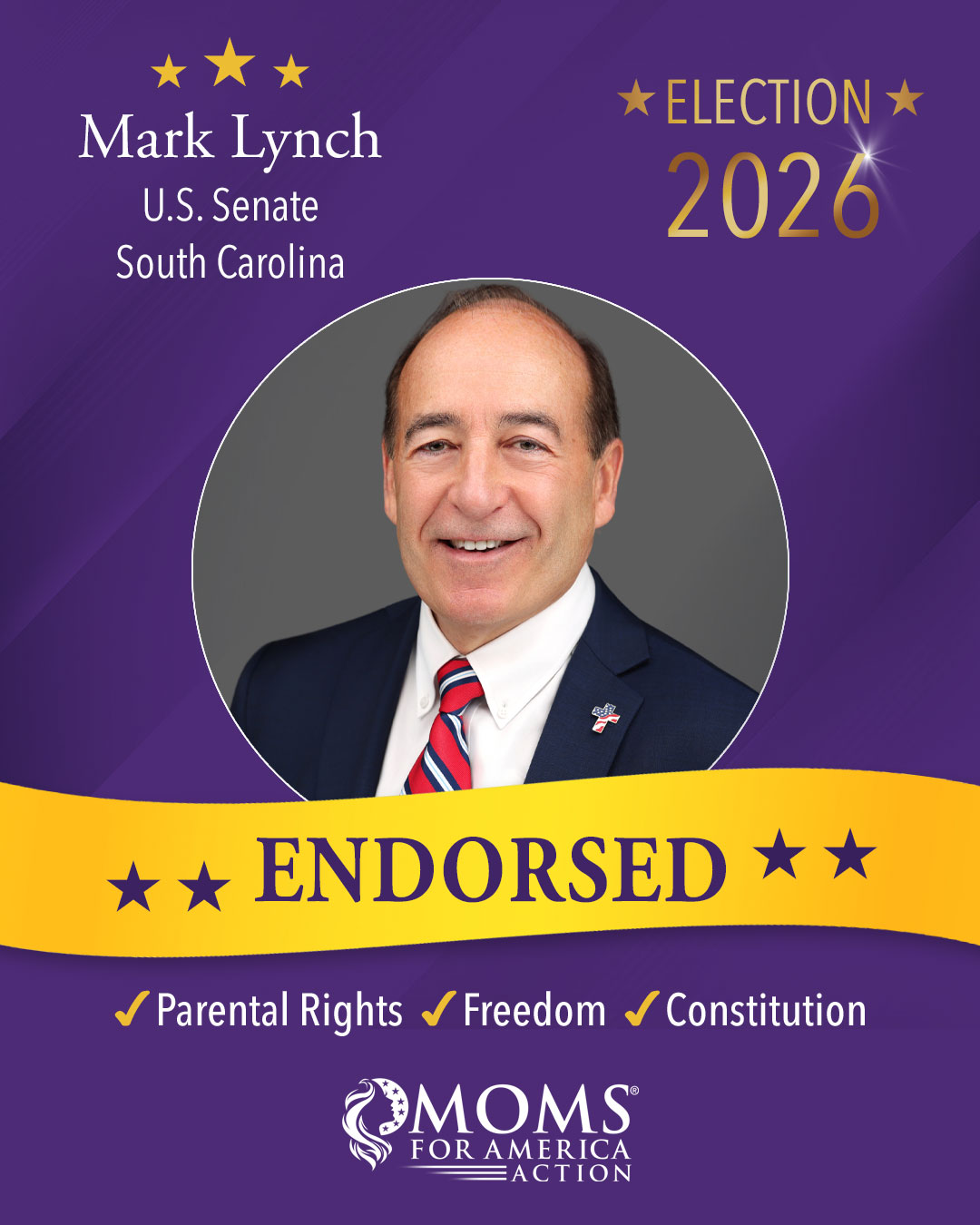 Moms for America Action endorsements apply only to the current election cycle and are not transferable to future election years or other elections.