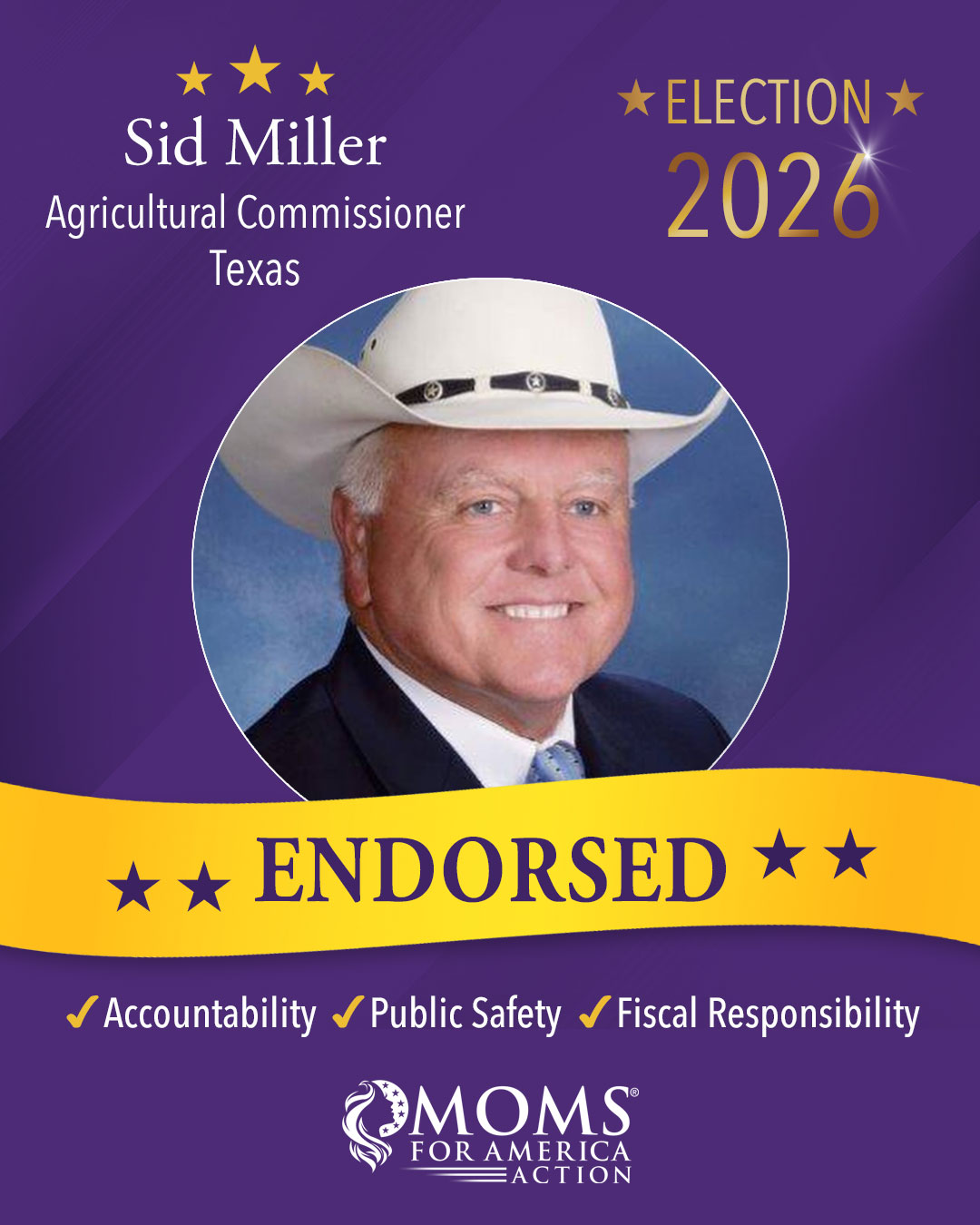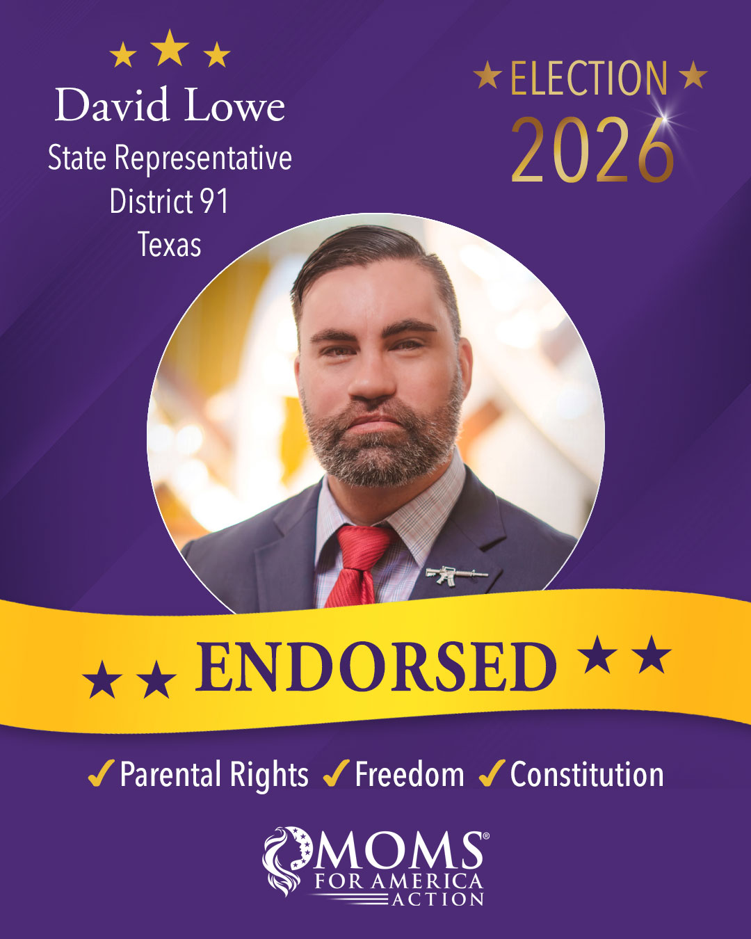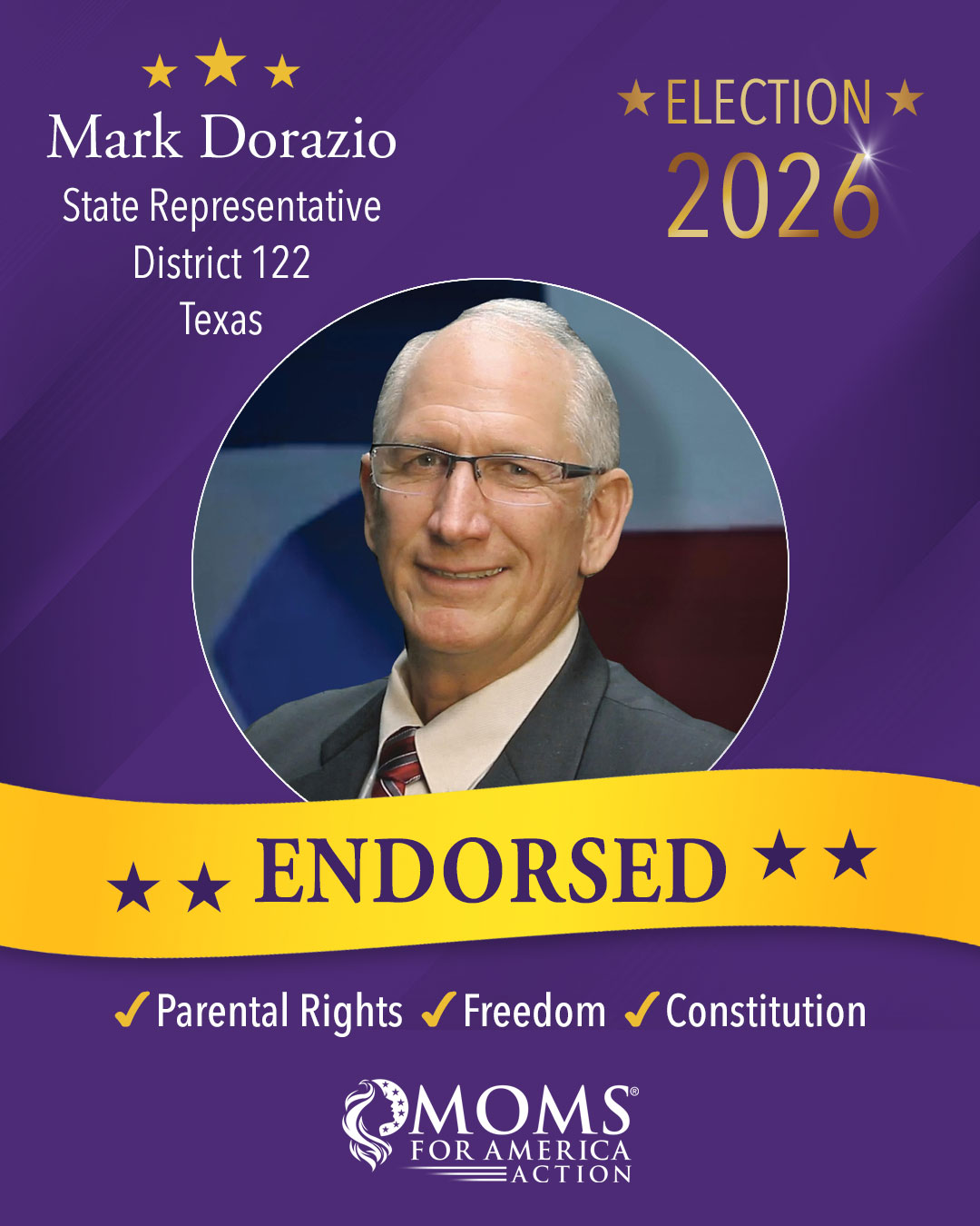 Moms for America Action endorsements apply only to the current election cycle and are not transferable to future election years or other elections.