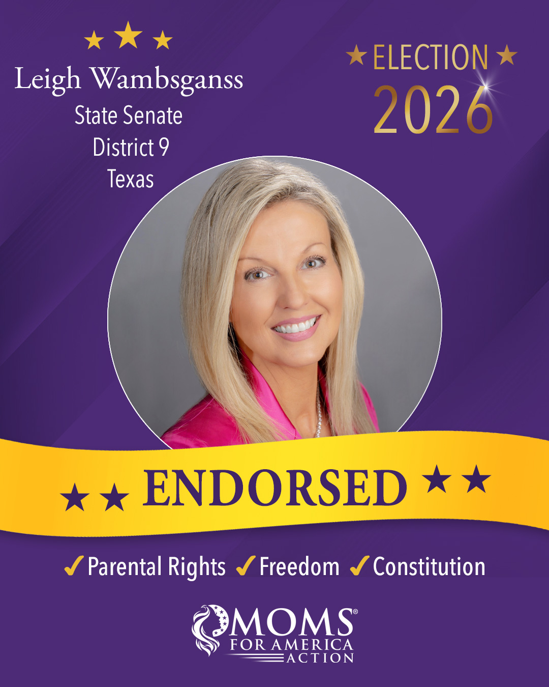 We understand that as a mom, you want to make informed choices that will impact your family and community. Check out our endorsed candidates in the tabs below for additional county and state endorsements. Just click on your state in the index bar on the left, we’re actively endorsing Federal, State and Local candidates for races in 2026, so be sure to come back to this page often! Together, we can amplify our voices and support candidates who prioritize our children’s future and uphold the principles we cherish.